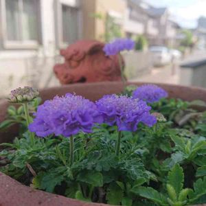 スカビオサさんを鉢の中に閉じ込めて4年目、矮小化していて、こんなに茎が短く❗。お花はしっかり綺麗だな‼️❣️。 横顔はシーサーくん。こわい顔してるわ😁。