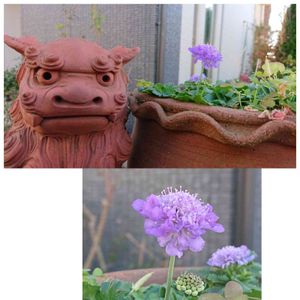 矮小化しちゃった「スカビオサ」咲きました。植え替えしようと思うのですが、このサイズが気に入っていて😁このままです。 (横に居る鼻の穴の大きなのは、お友達のシーサー君です。邪魔ですか?😁。)