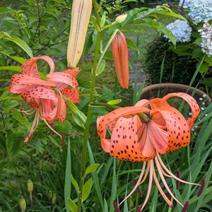 オニユリが咲きました🧡 庭のあちらこちらに咲き誇って、 一気に夏の庭になります☀ まだ掘って食べたことはありませんが😅、スーパーなどで売っている百合根やムカゴはこの鬼百合のものです🔍️