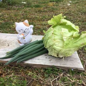 本日の収穫。キャベツ、葉大根、コブ高菜、ターサイ、葱、水菜、アスパラガス、フリルレタス。
