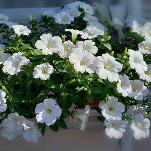 💮ペチュニアおゆきちゃん💮 だいぶ咲いてきました。 今年はおゆきちゃんの大鉢4鉢です。 丈夫でお手入れも楽ちん😊 まん丸に咲かせる勝手なプレッシャー?からも開放され、真っ白なお花を楽しんでます。 今日は風も強く気温も33℃になる予報💦 熱中症注意ですね😥
