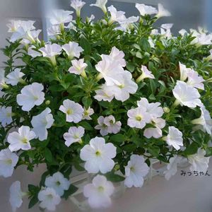 ペチュニア さくらさくら&おゆきちゃん 混色 ✂️の繰り返しで、やっとまとまり咲かせました。 この親株からは、た~くさんの挿し芽もでき、 とっても強いお花です。 後ろが挿し芽っ子✴ 長雨で✂️をした、さくらさくらも咲いてきて、 勢揃いです✨ 他に、地植えの子も元気に咲いてます😊