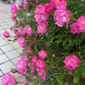 可愛いピンクのバラ 棚に添わせて幅広くたくさん花を咲かせていました