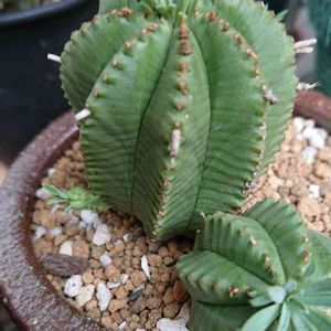 今朝の気温19度 涼しい朝だった😊 10〜11時になると気温上昇して 遮光シートを掛けた😅 変化のあまりみられないカメレオンヘルメット🎈 それでも頭に小さい葉を繁らせて秋は動くのかな🍀 ちょっとお日様に当てすぎた🎵 サボテンではなくユーフォルビア属 オベサなどと同じなのね!