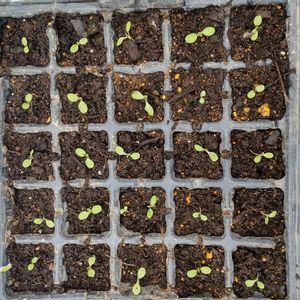 4/3ポットに適当種まきしたサニーレタス🥬の状況😅 少し育ったかな〜🥬、今年は寒暖差が大きく夜の低温が続き育ちが悪く四苦八苦😅