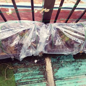 昨日のサニーレタスの様子です🧐 前回撮影よりひと回り成長しています。 4株とも順調に生育しています。透明のゴミ袋をかっとして無理やりカバーを作りました😅 この使っている培養土は2回リサイクルした土で、 追肥は1月初旬に1度だけですが元気です。 余談ですがリサイクルには、再生材を買いましたが結局使わずにしました🧐 🙋腐葉土、パーライト、ピートモス、バーミキュライト、籾殻、燻炭、化成肥料。これがリサイクルに使った資材でした🙋