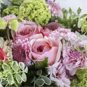 [Bouquet] 薔薇とクレマチス、ダリア、スカビオサ、ビバーナム、コロニラバリエガタ、ゼラニウム、ユーカリ。大切な人へ。