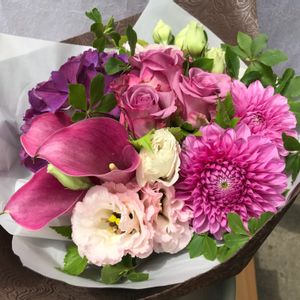 ライラック、トルコキキョウ、ピンクレースフラワー… 淡いピンクのお花が揃ったのでブーケに束ねてみました。