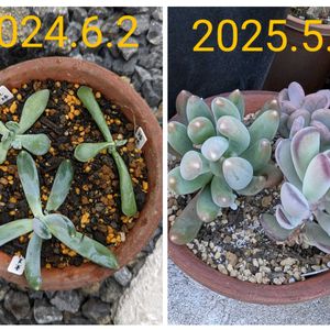 ご無沙汰してます🤭 久しぶりpostします ウィンクレリーほんのりピンクになりました🩷 2枚目、大鉢寄植えのエケベリア 名前不明になりました😅 GS始めた頃anちゃんに頂いた子 東美人は2つになりました♥