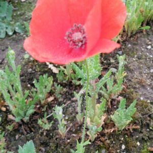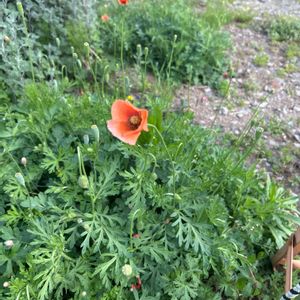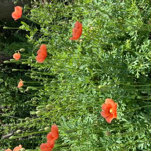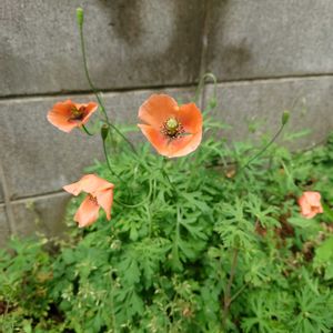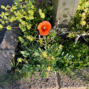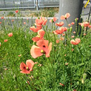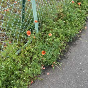 お散歩の途中、ナガミヒナゲシに出会いました。 花壇と道路の隙間に並んで咲いていました❗️ 黒い紋のついているのもあるらしいですが、ここにはありませんでした💞