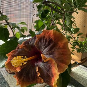 こんにちは〜♪ ようやく ハイビスカスのミステリーサークル🟠🟤🌺が1輪咲きました〜🎵⊹( ⌯'ᵕ'⌯)⊹