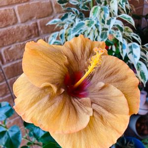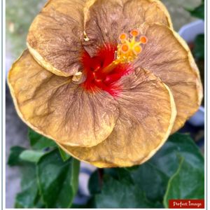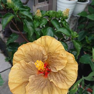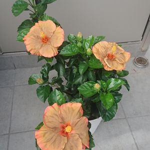庭の鉢植えのハイビスカス 👽 (伊良湖岬のハイビスカス ミステリーサークル) 😱 ブロンズ系のクラシカルな色合いの品種です 最初の花はブロンズ色でしたが 徐々に色がゴールド系に変わってきました😳 ハイビスカスには暑すぎるようで☀蕾が落ちるため 半日陰の少し涼しい場所に移動しました
