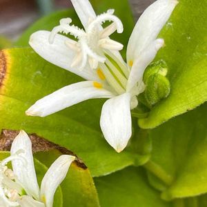 秋🍂になると 清楚な純白花を咲かせます🎶 花は上向きに咲く6弁花で 喉元に黄色の斑があります💛 (知り合いの庭 鉢植え🪴) 白花杜鵑(しろばなほととぎす) ユリ科