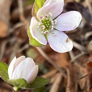 早春に開いた花弁のように 見える部分は〰︎ガク片で 花弁はありません (知り合いのお庭 鉢植え) 雪割草(ゆきわりそう) 別名 三角草みすみそう キンポウゲ科