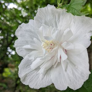 🤓雨中で白い八重の『ムクゲ』発見! 😎札に…『大…仙…祇…園……守』 🧐どう読むんだ???