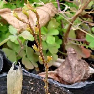 アメリカンザクロ 去年手に入れたザクロ食べた種子植えたら芽が出てきて早い段階で枯れたので無理かと思ったら春になって新芽が出てきたよ(^_^;)💦植物の七不思議(^o^)