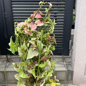 2picめ🌱 いつもは室内に置いてるシンゴニウムちゃん。 水やりのために外へ。 ダイソーの300円のコですが、高さ 72センチまで伸びました😲 植物園なんかでめちゃくちゃ巨大化してるコらしく、どんどん伸びるみたいなので(剪定オッケーみたい) 支柱の輪っかの1番上あたりで切りました✂️