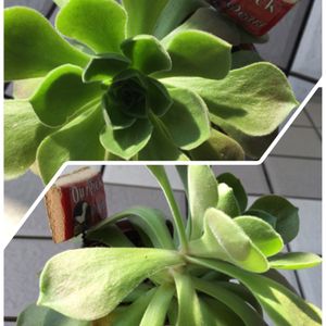 アエオニウム属のバルサミコ酢ぽいお名前のバルサミフェルムさん。。。 レモネードに似てますが別モノでしょうか?未だにわかりません💦 最初は寄せ植えしていたのにこの子だけ大きくなってくれてリメ缶が見えないくらいの成長が著しいお方で徒長気味、脇芽も見られます😅 葉がモケケ気味で茎も柔らかそうでチョンパするかものすごーく悩んでます💦 チョンパして根っこがでるタイプでしょうか??お詳しい方がおられたら教えていただきたいです。 あと最近少し葉の一部が少し茶色ぽくなって葉焼け?模様?よくわからないです💦夏の暑〜い日差しでもお焦げにならなかったから模様なんですかね。まだまだわからない多肉ちゃんの世界です。