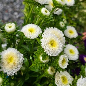 ( *ˊᗜˋ)ノこんにちゎ〜ꕤ 🌸 アスター 🤍💜あずみ 🌸 お墓🧹 お参りも終わり ようやく見る事が出来た 青空 に (*´∀`)=3 ホッ 日照り 水不足で 🌿🌿🌿が ちょっと 傷んでしまいましたが 自分が 育てた お花も 一緒に お供えする事が 出来て 良かったです( ^ᵕ^) 午後も 穏やかに 過ごせますように🍀*