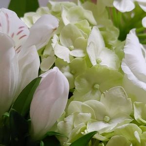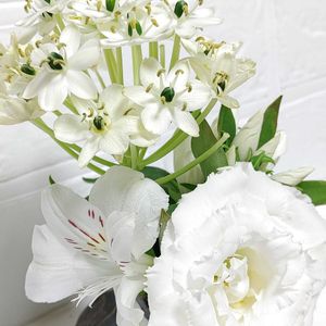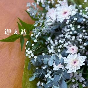こんにちは☀︎ とても良いお天気です 親しくさせてもらっているお隣さん 偶然に夫婦揃って同年齢なんです🫢 お母様を亡くされて49日を迎えられるのでお供え花のアレンジを作って届けました😌🤍 トルコキキョウ カーネーション 孔雀草 ブルースター アストロメリア ギボウシ ユーカリの葉です