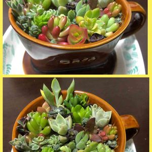 まだまだ、活躍してます(笑) 強い味方(✊>👃<*👊)♥センターポンチ コーヒーカップに穴開けてデコパして🤣 チョンパ✂️した多肉を寄せ植え~😆 蒸れの事、考えてないけど大丈夫🤔💭 やってしまってから考えても遅いね😅