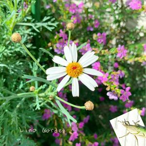 花壇のマーガレットが咲いてました 後ろに見えるのはクフェア 夏からずっと咲き続けています❣️ タニクちゃんにかまけて 花壇を見てないうちにバッタが侵入してました(๑-﹏-๑) 確保ならず💦