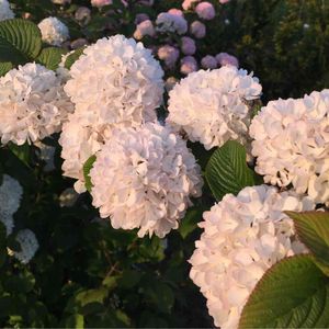 昨日の散歩先、夕陽のかかった大手毬。写真では少しだけ紫陽花のようにも見える。