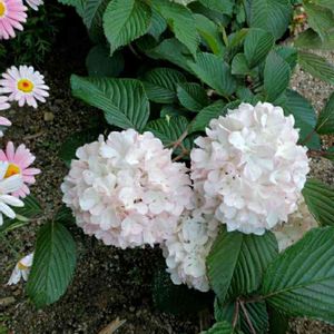 一昨年お迎えして、去年は咲かなくて、今年やっと紫陽花のような大輪の花をつけてくれくれました🎵 買ってきたときは確かに真っ白だったけど、今度咲いたのは淡いピンクが入ってます。 近くにピンクの紫陽花要の肥料を蒔いてたせいかな~? でもこれはこれで綺麗💗💗