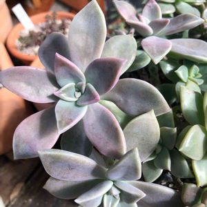 ⏪前のpicより 【グラプトペタルム属 パラグアイエンセ ラベンダーフォーム?】 Graptopetalum paraguayense 'Lavender Form' 園芸品種名 朧月(斑入り?) 昨日、朧月の群生を見たので、 斑入り?を投稿させて下さいね 「斑が消えた」との情報を ネットで見付けたのですが、 子株のふたつは斑が有りません 朧月の斑入りを殖やしたく、 葉っぱをモギモギちぎって タニ友サンにバラマキ中 殖えたら返してもらう予定(笑) アンズチャン、イッパイフヤシテネ( ˘ ³˘)♥
