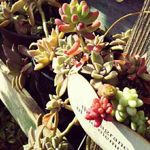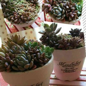 先日 塗り比べした (みどりのまとめUP中) 素焼き鉢をほんのりピンクのグラデーション&デコパージュして早速 寄せ植えしてみました🎵 …が寄せ植えって上手に出来るか不安であまりチャレンジしたことがないんです(汗) とりあえず100均や家にあった多肉ちゃんを集めてみた 多肉デビューして半年…今年は寄せ植えやリメ鉢やるぞ~~
