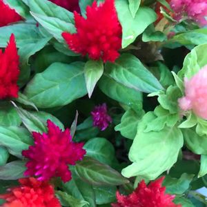 こぼれ種ケイトウさん✨ 思いきって摘芯したらいっぱい咲いてくれるかな?😊 切るのもったいないくらい可愛い➰😊 奥は、 アメリカンブルー カリブらコア トレニア、、、 です😊