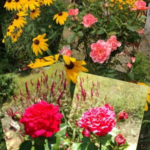 今日のお花💕 ↖↗ルドベキア🌼 6月撮影👀📷✨ &🏷️真っ赤な火曜日♥️ ↙↘薔薇🌹の後ろでケイトウがメラメラ🔥燃えてます(ФωФ) 今日?撮影↑と同じ場所💞