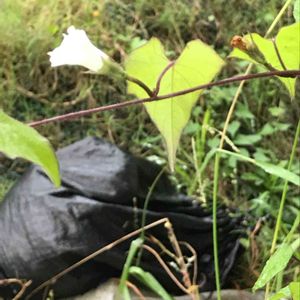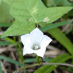 豆朝顔(マメアサガオ) 輸入穀物に混入して渡来し、1955年に東京近郊で帰化が報告された北アメリカ原産の帰化植物。荒れ地、空き地、道端などに生えるヒルガオ科サツマイモ属の1年草。熱帯に分布の中心があるので沖縄など暖かい地方で盛んに繁殖し、ほぼ一年中花が咲いている。花は直径2㎝ほどで普通白色、稀に淡紅色。 星朝顔に似ているが、花色、萼裂片、花柄で見分ける。本種は普通白色で、萼裂片は長く尖り、花柄にいぼ状突起がある。星朝顔は淡紅色で萼裂片の先が短く尖り、花柄にまばらに突起がある。 出典『夏の野草』『日本帰化植物写真図鑑』