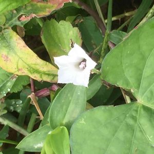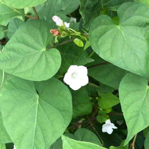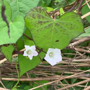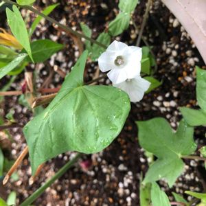 こんばんは 写真の整理をしていて、あれっ‼️ ハート💚 💚 💚 💚 9月の雨の日☔️のお散歩で。 ハートに気づかず、白い花を写していました。 このお花の名前も教えてください。 マメアサガオと教えていただきました。