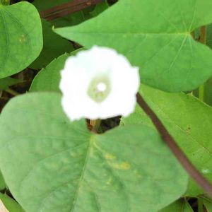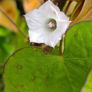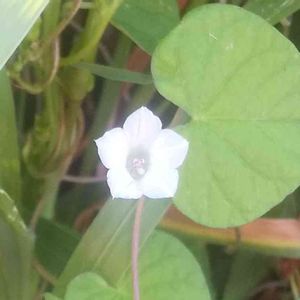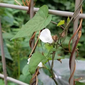 ベランダに置いてある朝顔の鉢植えから小さくて白い花が生えてきた。葉っぱの形が違うから朝顔ではなさそう。 虫か鳥が運んできたのかな? 調べても花の名前がわからない😭