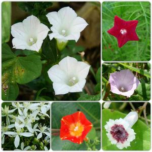野に咲くツル植物の 小さなお花たち。 ずっと雨が降らず 誰がお世話をするわけでもないのに 頑張ってお花を咲かせています。 白のマメアサガオは2cm位ですが近寄ってみると可愛い✧*。 ピンクもいます。 (赤とオレンジのルコウソウは毎年こぼれ種でお庭に生えてくれます♪)