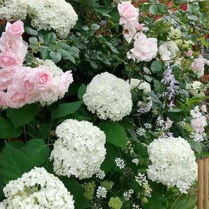 白アナペル♡♡ ニュードーン いつもの場所!白くなったアナベル綺麗です。優しいピンクニュードーン。一番花終わりに違っく! 水曜ローズショー参加します😊