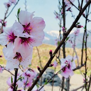 少し前で申し訳ないですが庭先でアーモンドの花が咲きました。 今は梅の実を細長くした実がたくさん実ってます。 秋にアーモンド採れるといいな❤️