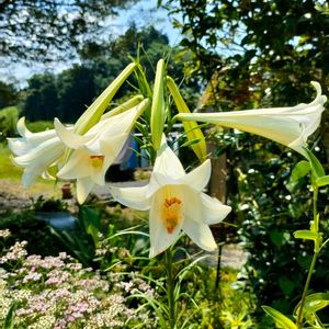 今日のお庭 テッポウユリ ベゴニア ナツズイセン ガーベラ コスモス 梨 (*˘︶˘*).。*♡ 先程猛烈な雨⛈️が降りました…水撒きは休めるけど😓 5枚目 お隣の梨園😋