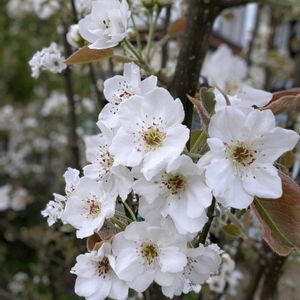 🍐今日のお花🍐 西洋梨のラ・フランスで~😊💗 和梨の花より小さめの花です🎵 実は 只今成長中ですね😁💓 手の届く所に🍐が~😆🎶 でも 公園の木なので捕れないわ😂 🏷️金曜日の蕾たち