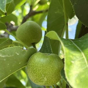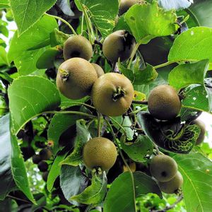 今日のお花 お花じゃないけど ナシです 先月 植物公園で見た まだちっちゃな梨の実 名札がサルナシって書いてあったのですが どう見ても違うよね ツルじゃないし