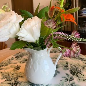 今週のお花が届きました💐 出したばっかりなのでちょっと平べったくなってますが白のトルコキキョウが爽やかです😄