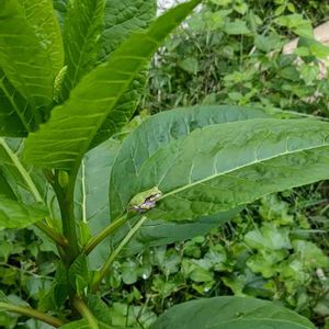 ニホンアマガエルがヨウシュヤマゴボウの葉に止まっていました。