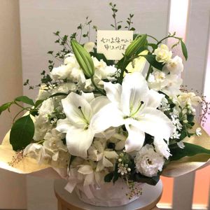 お供えのアレンジメントです。 宅急便の最大サイズでお送りしました。 今の時期としては気温が低いので生花の発送については助かりますが、日照不足や災害等、天候が不安定なのは心配です。 暑さに強いシンビジュームとユリをメインに、オキシペタラムの白、定番のトルコギキョウ、ヤマゴボウやドウダンツツジなどの季節の枝物を少し添えました。