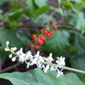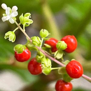 🪴ベランダの花(実)たち その16 ジュズサンゴ(数珠珊瑚) 昨日と同じヤマゴボウ科の植物です♪ 白い小さなお花と 赤い小さな実が とてもキュートです♪ ☀️ *・゜゚・*:.。..。.:*・''・🏝* ✨:.。.🐬 .。.:*・゜゚・* ⌘ メモ ⌘ 🔸科名・属名 ヤマゴボウ科 ジュズサンゴ属 🔸学名 Rivina humilis 🔸英名 pigeonberry rougeplant baby peppers bloodberry 🔸原産地 アメリカ合衆国南部~熱帯アメリカ 西インド諸島 🔸花期 6月〜9月 🔸花色 白 🔸結実 随時 🔸特徴 常緑多年草。 草丈40cm~2mほどになる。 半つるの低木状になり、茎は緑色で、上部でよく 枝分かれする。 日本には明治時代に小笠原の父島に入ったのが 最初とされ、野生化している。 葉は互生する単葉で卵形。葉柄は1~3cm。 葉腋から総状花序を出し、径4mmほどの花を 多数咲かせる。花には花弁はなく、花弁状の萼 が十字に開き、萼は白色で先端がピンク色を帯びる。 果実は径5mmほどの球形の液果で光沢があり赤く 熟す。果実は染料として利用。