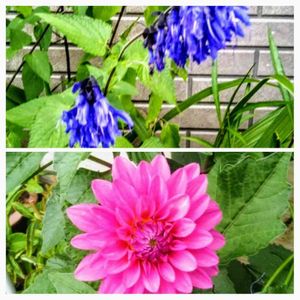 私の好きなダリアがありました🎵💕枯らしたアイコンと同じ色です😄上の紫色の✿はなんでしょうか?よろしくお願いします^_^; メドーセージみたいです ご近所さん