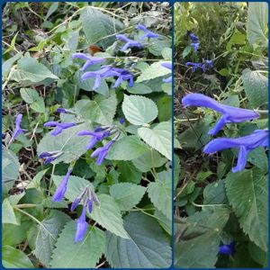 サルビア•ガラニチカ‧*॰:。.🦖 小さな鉢植えのまま 常緑で冬越しして 開花しました♪😊 鮮やかな群青色の個性的な花も 色も形も綺麗な葉も大好きです(๑´`๑)♡︎ 台風🌀の影響か、急に雨が降ったり止んだり不安定なお天気です。