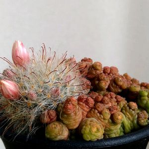 マミラリアの変化型。 冬に縮んで春にモリモリデカくなる。最近出たモリモリにはトゲがある。 お花が咲くわけじゃないけど、なんか面白くて眺めてる。