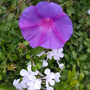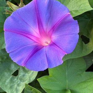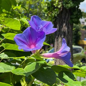 色鮮やかなブルーが印象的な、「オオバアメリカアサガオ・"オーシャンブルー"」でおはようございます💙❤️ 公園の原っぱに忽然と、見上げる程に草丈高く生長した朝顔の蔓が塔のように現れて、二輪だけ、ピッタリ寄り添うように咲いていました😃 "オオバアメリカアサガオ"は、メキシコや中央アメリカ、カリブ海といった亜熱帯地域に自生する蔓性の多年草🇲🇽🏝️ 花弁は直径10cm程のくっきりした青紫色の大輪で、中心部に赤紫色のラインが入ったツートンカラーが特徴です。 初夏から例年11月頭頃にかけて、次から次へと咲き始める開花期の長い朝顔ですね💕🗓️✨ ー別名は、「野朝顔」、「琉球朝顔」。 ー花言葉は、「愛情の絆」、「明日も爽やかに」…他。