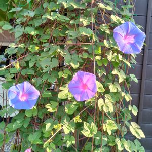 猛暑の夏こそ元気いっぱい "オーシャンブルー" 紫がかったブルーが美しい🟣 散歩道の至る所で目にします 生垣はもちろん電線、フェンス、樹木などに絡みながら勢力を伸ばしていきます🌲 逞しさと情熱的な美しさを魅せる花ですが、高所なので撮影には苦労させられます📸 ヒルガオ科、サツマイモ属 別名 ノアサガオ(琉球朝顔) 流通名 宿根アサガオ、イポメア インディカ、ケープタウン アサガオ オーシャンブルー 原産地 沖縄 成長力が逞しく地植えにすると10m以上にもなるそうです🙀 夏のグリーンカーテンにいかがでしょうか😄🌿 Wikipedia参照